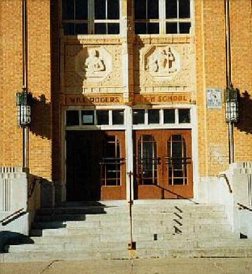 The building itself was an art deco design. The elaborate buff brick school features two large towers at the front corners of a large main block of classrooms. The towers are supported by stepped pilasters with ornate details in terra cotta "capitals". Panels above the double doors feature Will Roger's life in two phases. One depicts his cowboy days with a horse, roped steer, and the prairie, and the other his movie days with a reel camera, airplane, and polo rider.